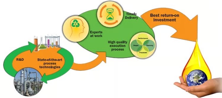 We are experts in the design of process equipment for distillation, evaporation, hydrogenation, filtration and adsorption, as applied to recycling of liquids such as used oils, waste fuels and industrial wastes. Our technologies are world class in robustness, ease of maintenance, energy efficiency, product qualities and yields. Sequoia applies well researched and proven process design at the core of each application offered to the market. Sequoia has built a team of experts in the areas of detailed engineering and project management. Additionally, we have invested resources in developing proprietary equipment specifications and identifying reputed vendors who supply these equipment. Sequoia has an active research and development program that aims to keep Sequoia and its customers ahead of their competition.